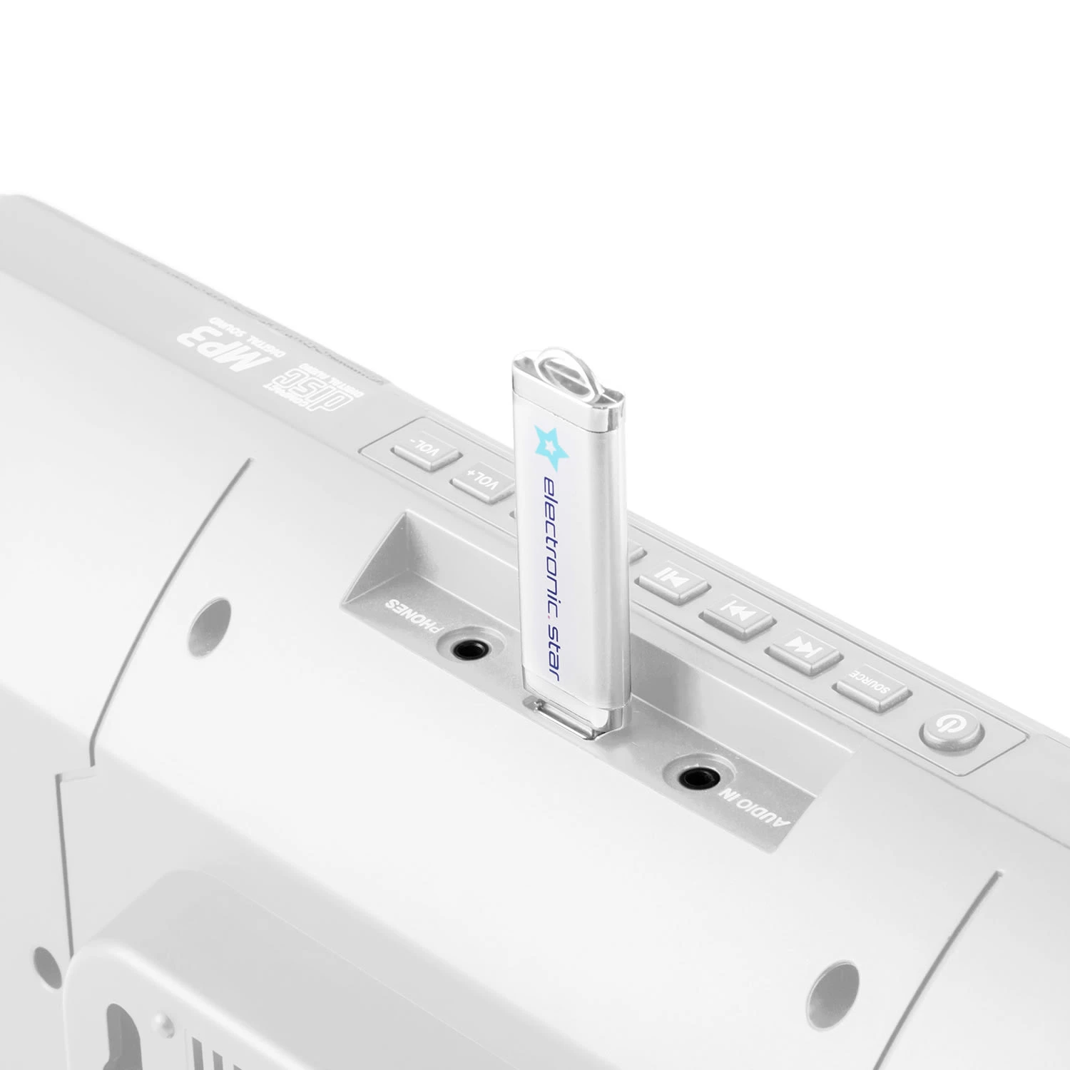 - Anschlüsse: 1x USB-Port, 1x AUX-3,5mm-Klinke-Eingang, 1x 3,5mm-Klinke-Audio-Ausgang für Kopfhörer